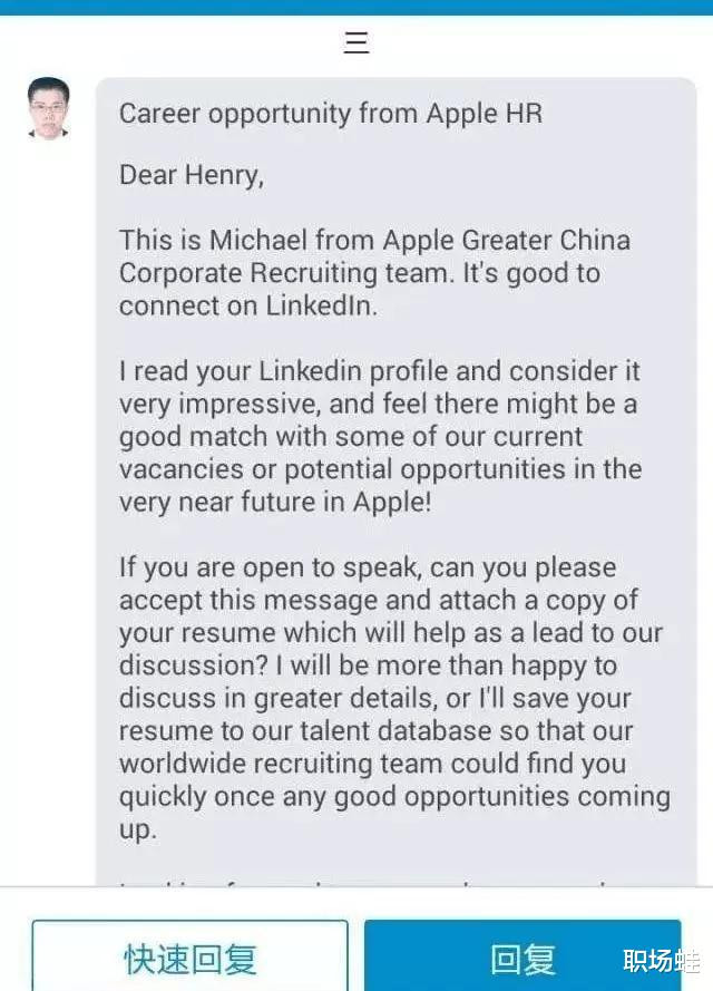 上图就是那次我收到的苹果来信,发信人是他们人事部门的招募主管Michael。那时领英(linkedin.com)还没退出中国,我也就偶尔上一下,也没投递任何简历。我想,既然苹果HR这么主动,我也就接触接触了。